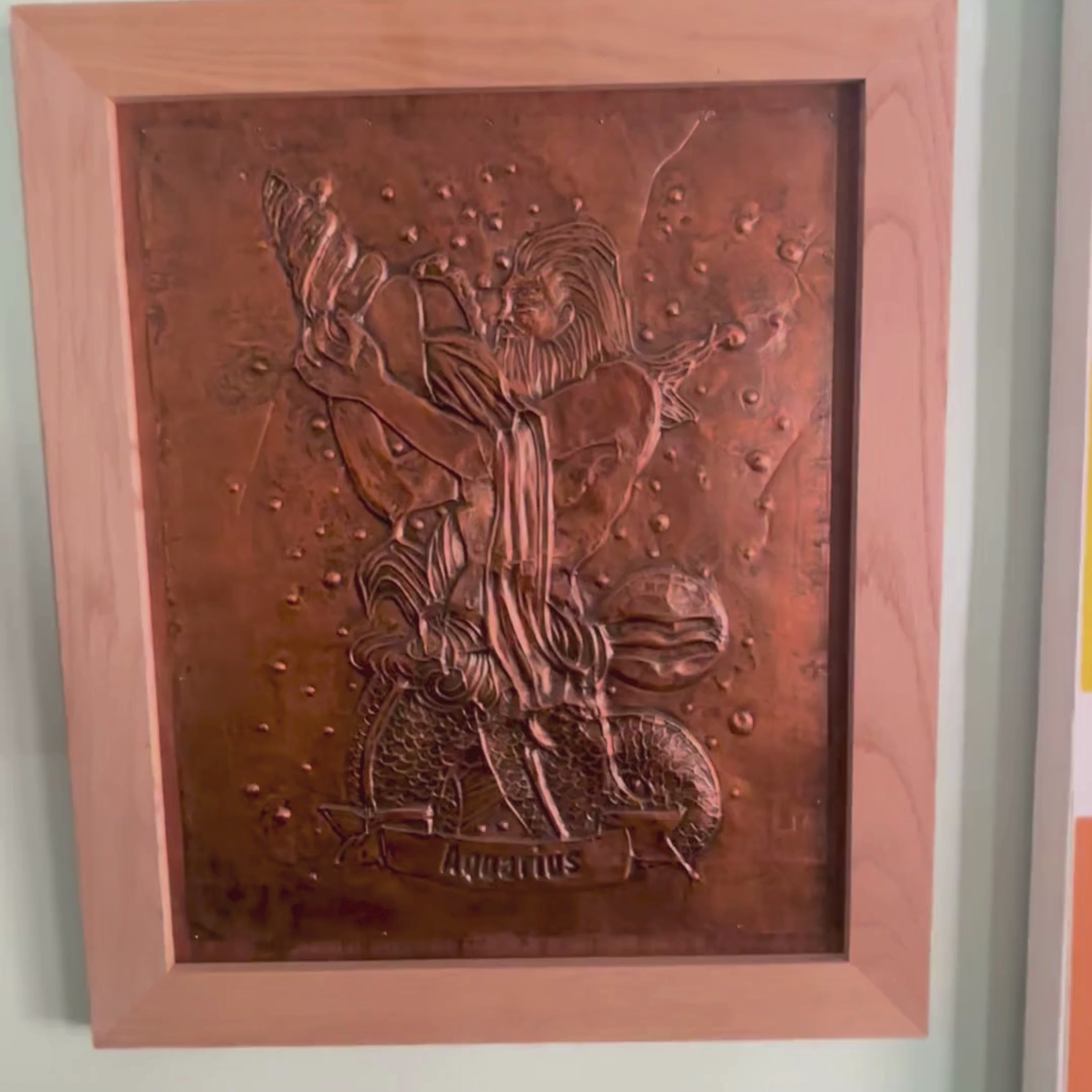 Gorgeous hammered copper art depicting a merman pouring water out of a seashell with the banner Aquarius. The copper is tacked to a thin wood board and framed in a light colored wood frame. Artist and date unknown, but if i had to guess I'd say it was from the 70s?